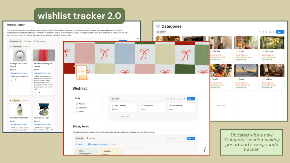 - A new sinking funds database that is linked to your wishlist. Here, you can organize purchases directly related to a sinking fund of choice (e.g., furnishing your new home, vacation, car).